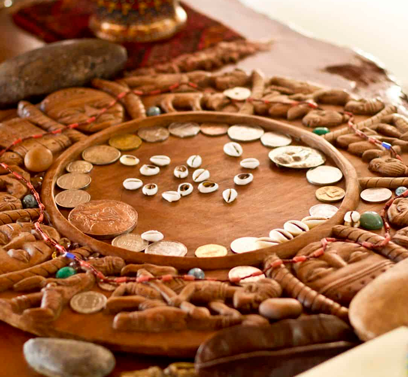 Pratico, como oráculo, o jogo de búzios (Erindilogun), seguindo o método utilizado na minha família africana.